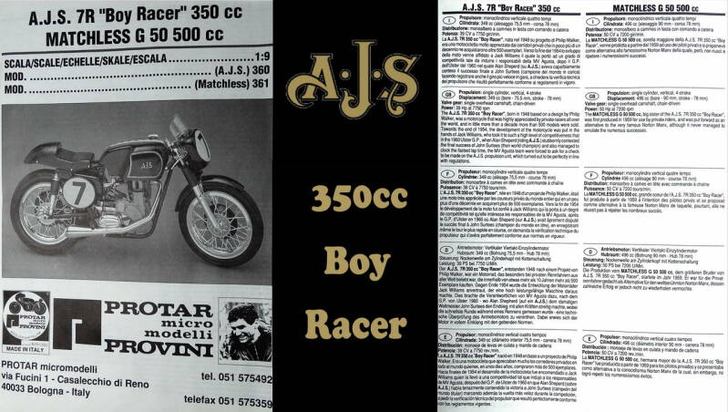De Ajs Boy racer behoort tot de vroege modellen van Protar. Aangezien de matchless G50 geïnspireerd was op de boy racer verschillen de modellen alleen op enkele details. Die zijn ook doorgevoerd bij de bouw en expliciet aangegeven in de beschrijving.