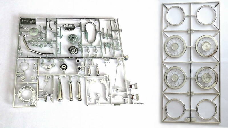 Bij de meeste bouwmodellen bestaat een wiel uit 2 helften. Bij dit model bestaat een wiel uit 9 onderdelen.