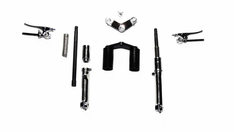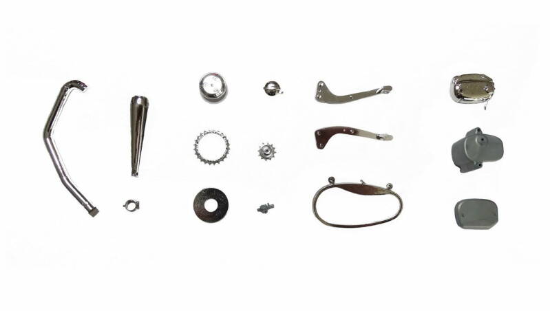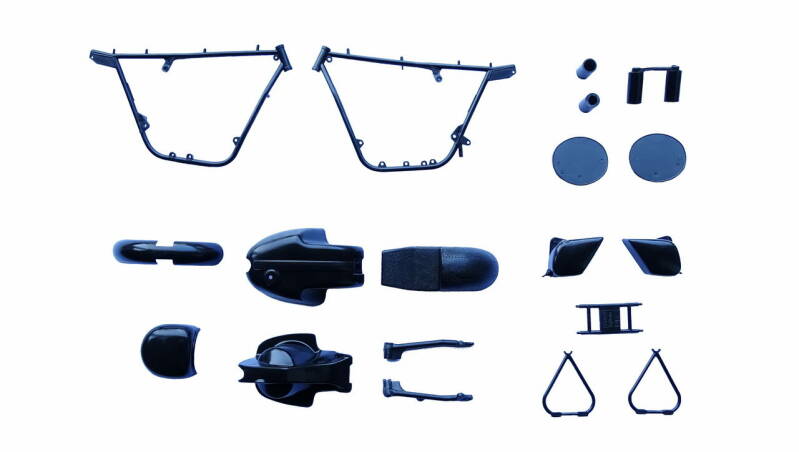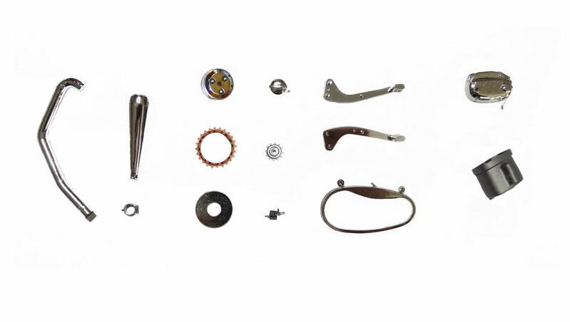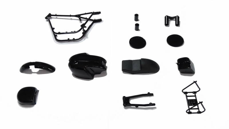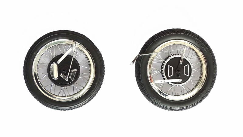 Het voorwiel is hier al deels gemonteerd. Het achterwiel ligt nog in losse delen.