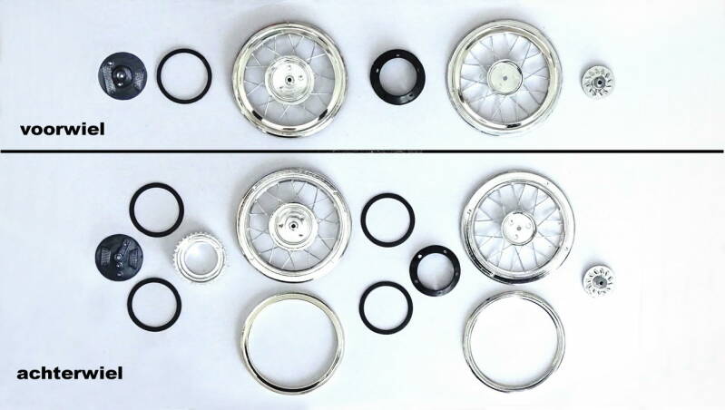 De naaf tussen de velgen wordt samengesteld uit diverse ringen die geklemd worden tussen de velg helften. Daarna komt aan de buitenkant van de velg nog een aparte velgrand die de band opsluit.