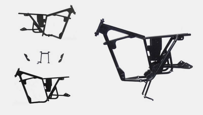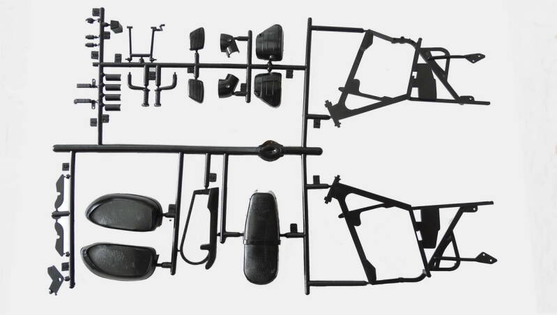 Het frame bestaat uit 2 helften die koud op elkaar verlijmd worden, dus geen pen gat verbinding. Goed opletten dat de helften niet verschuiven met lijmen. De standaard wordt tussen de frame helften geklemd. Dan dienen nog 2 vul platen aan de onderzijde in het frame gemonteerd te worden. Ook hier geen pen gat verbinding dus goed uit mikken waar zij moeten komen. De passing klopt niet helemaal dus licht in model vijlen.