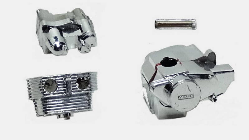 Uit eindelijk er voor gekozen het bovenste gekromde deel van de kop af te slijpen. Dit deel moet de bevestiging van het blok aan het frame verbeelden. Later zal ik hier een vervangende beugel voor in de plaats maken. Tussen de beide helften is nu een vulstuk geplaatst ter dikte van het frame. Nu past het blok perfect en kan het er weer uit om op kleur te brengen.