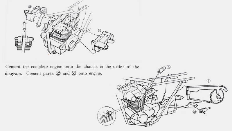 De tekening nog eens goed bekeken en het lijkt of de helften van de cilinderkop individueel tegen het frame gemonteerd dienen te worden. Er ontstaat dan wel een gat tussen de helften ter dikte van het frame. En waar slaat dan de pen gat verbinding nog op ? In het frame zit geen corresponderende pen gat verbinding.