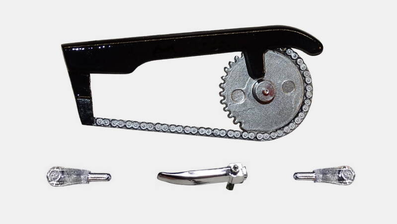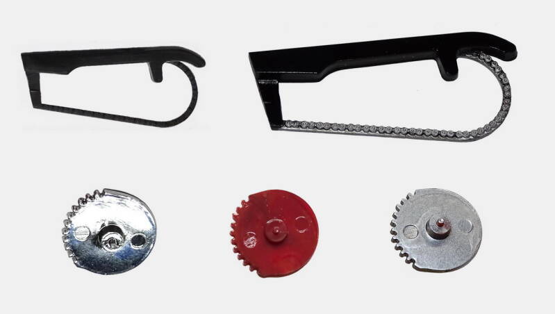 Bij deze kit wordt het tandwiel in de ketting verlijmd. Deze methode nog niet eerder gezien. Nitto had zo zijn eigen methode. Bij andere leveranciers wordt ketting en tandwiel als geheel geleverd. Bij de latere modellen werd het tandwiel en een rubberen ketting los geleverd waardoor het geheel kon meedraaien met het wiel.