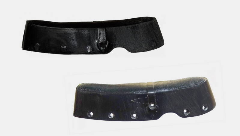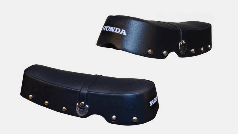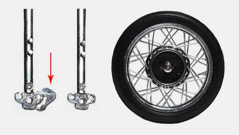 Op het zadel zijn kleine ronde verdikkingen aangebracht die de indruk van klinknagels moeten suggereren. Ze zijn niet mooi rond en onregelmatig gevormd. Dat krijg je niet mooi afgewerkt. Op de bovenste afbeelding heb ik de verdikkingen aan de achterzijde al verwijderd. Op de onderste afbeelding heb ik gaatjes geboord en voorbewerkt voor een nieuwe bevestiging.