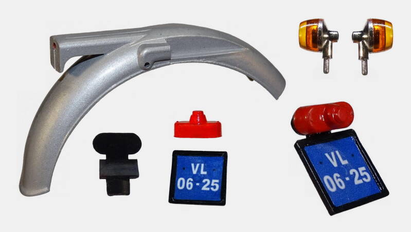 De kentekenplaathouder uitgevoerd in zwart. De meegeleverde brede kentekenplaat vervangen voor een smaller Nederlands exemplaar. De bevestigingsvleugels zijn ingekort. Achterlicht gekleurd en de richting aanwijzers zijn bespoten met "clear orange" van het merk Mr.Hobby.