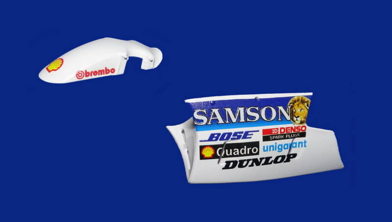 De decal op het front van de kuip was lastig aan te brengen. Omdat de decal zo dik is laat hij zich moeilijk in meerdere richtingen buigen. De decal moet van boven naar beneden en van links naar rechts buigen. Vergelijk het maar met een sticker op een balletje plakken. Dat lukt ook bijna niet zonder vouwen. Met decoset en decosol kwam ik een heel eind maar makkelijk was het niet. Hier zijn de dunne Tamiya decals in het voordeel.
