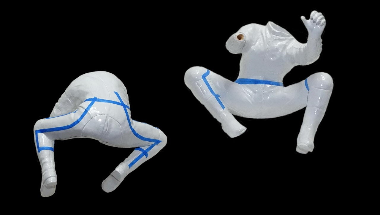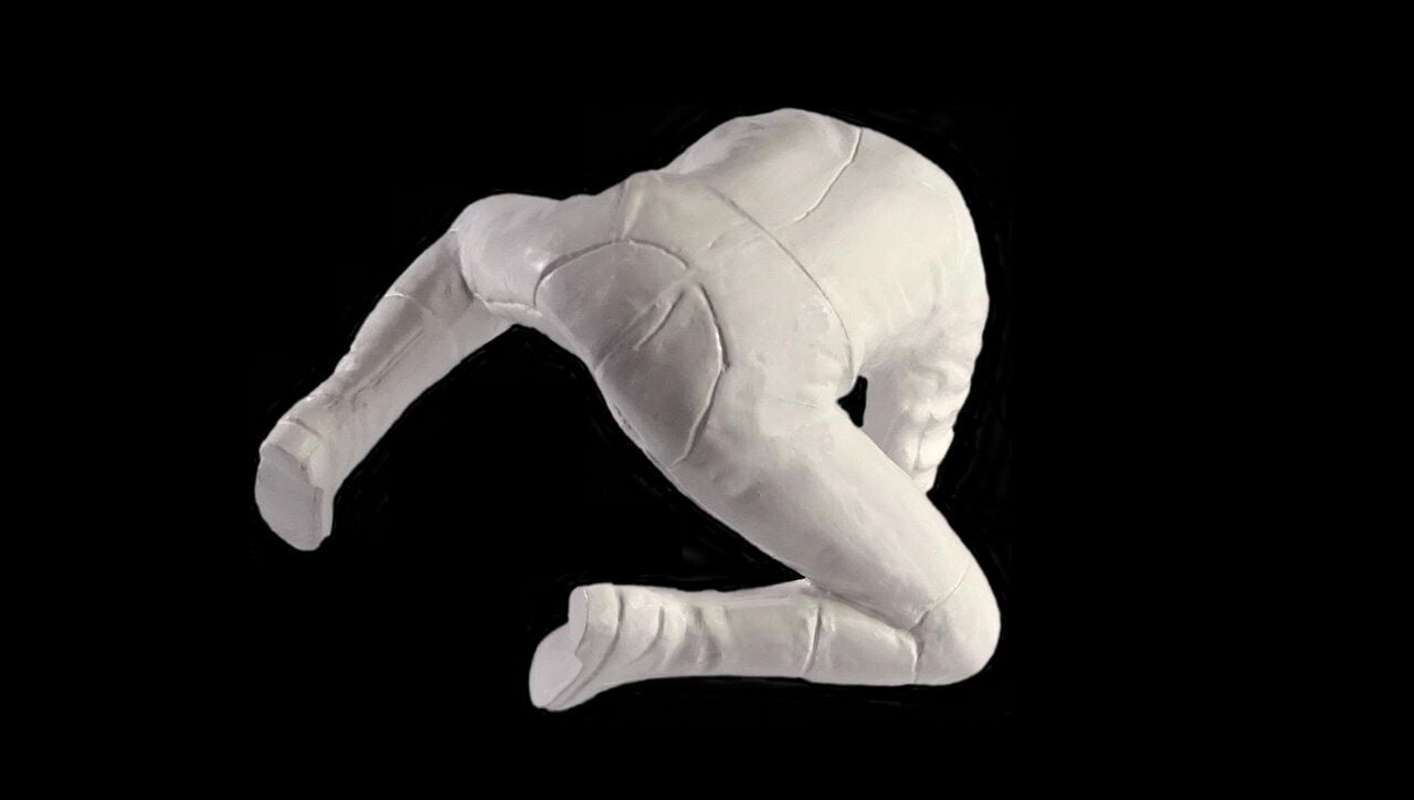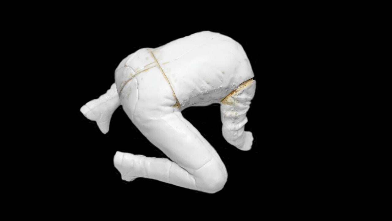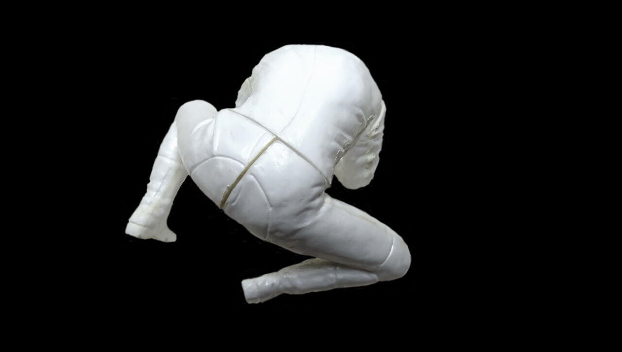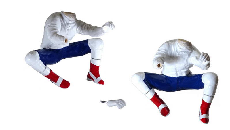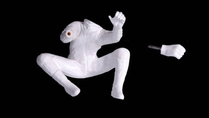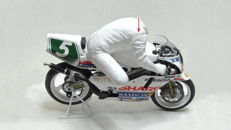 Bij het passen ontstond een probleem. Met de handen in de juiste positie verlijmd kreeg ik het model niet meer van de motor. De ruimte langs de tank was niet voldoende. Als oplossing de arm en de hand gevuld met laminaat vuller en een stalen pen ingebracht. Met deze aanpassing is het model goed te plaatsen en te verwijderen.