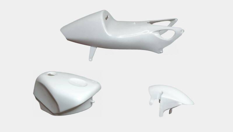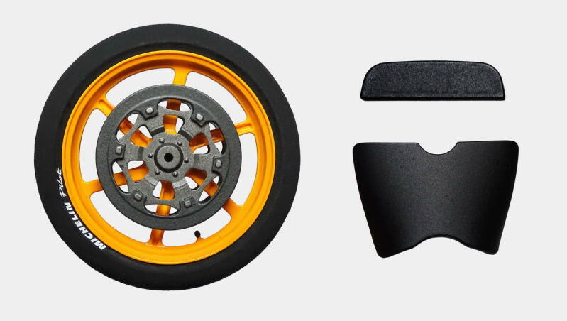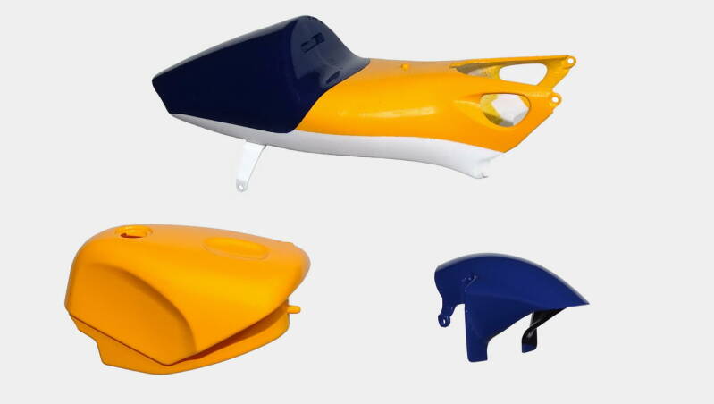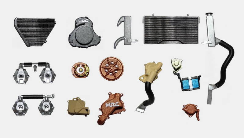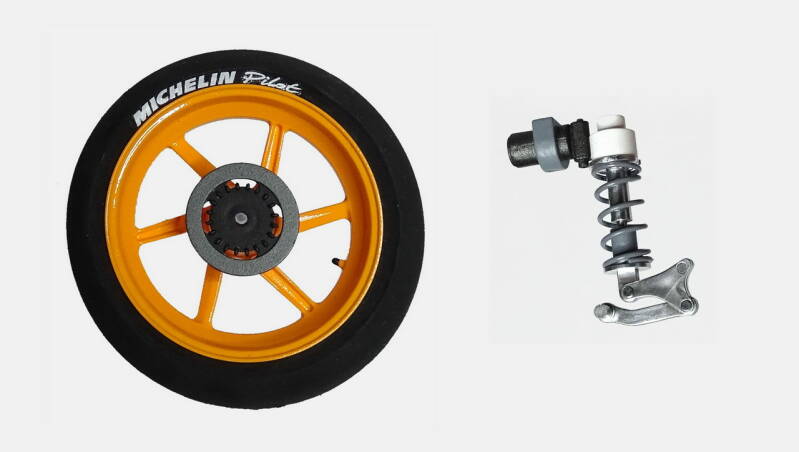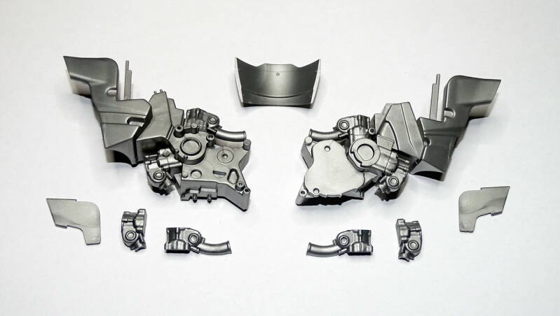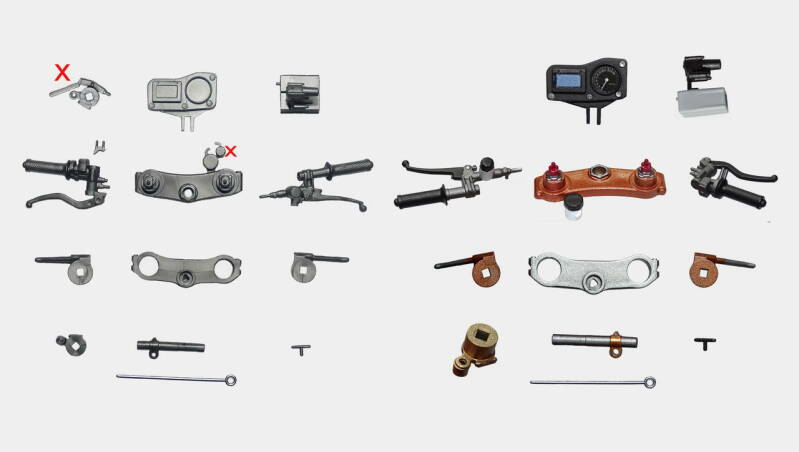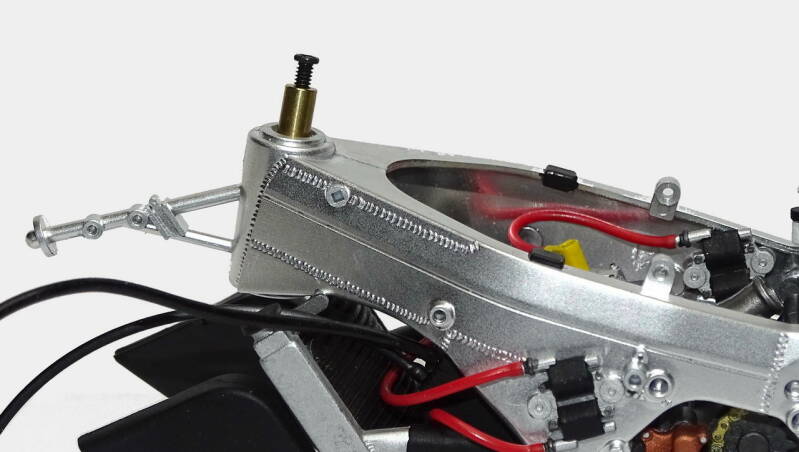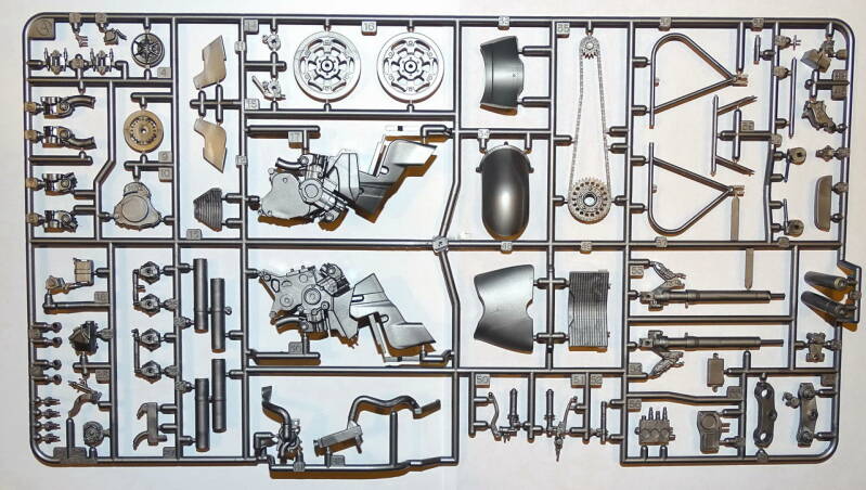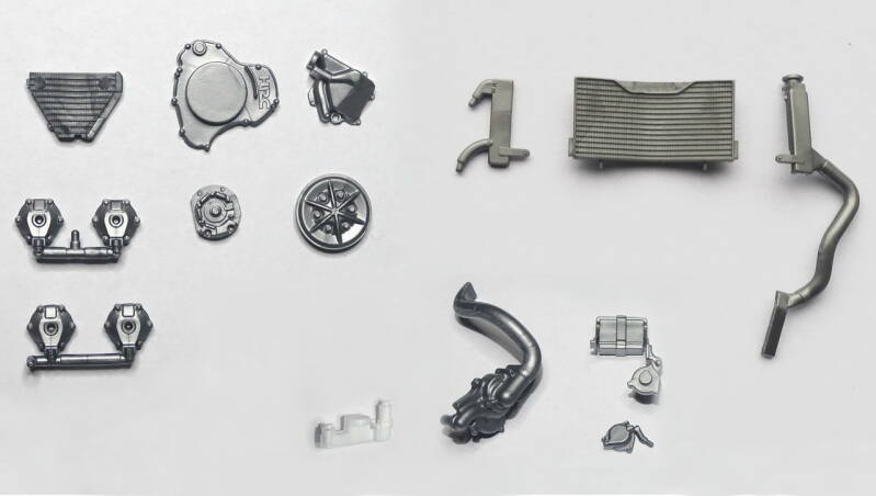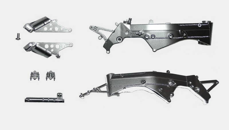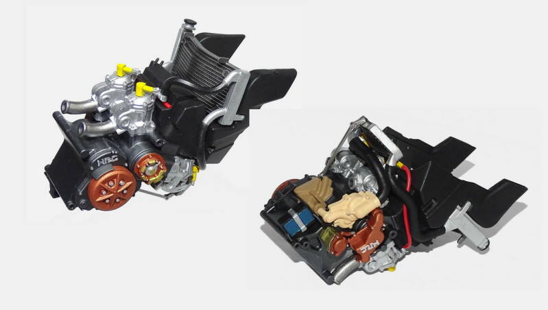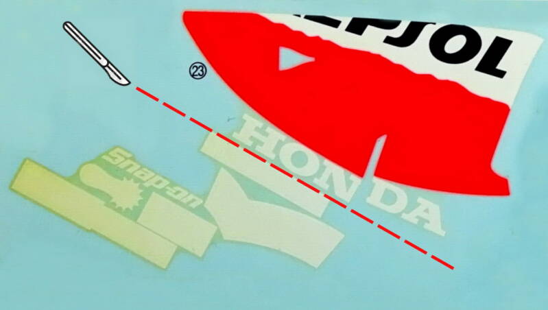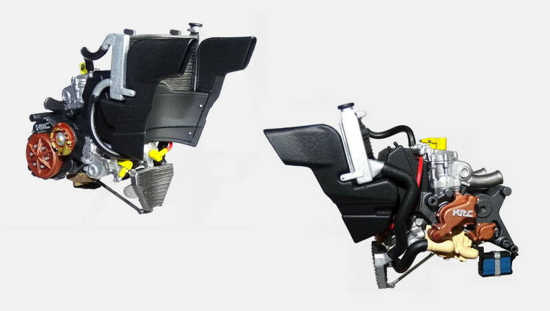 Vervolgens alle overige delen op kleur brengen. Let op ! Dit model kent 2 uitvoeringen waarvan 1 de uitvoering van Mick Doohan is. Door ernstige kwetsuren aan zijn been heeft men de achterrem van zijn motor gemodificeerd naar een handbediening. Die hoort niet thuis op dit model. De extra handgreep alsmede de kleine rempot op het balhoofd kunnen achterwege blijven (rode kruisjes).