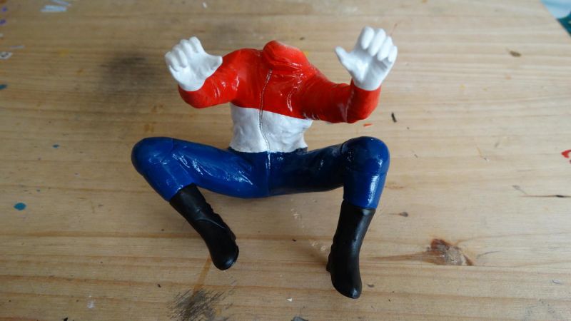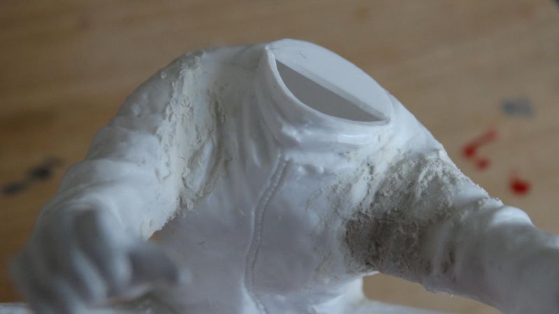 Het spuitwerk is klaar. Het gat bij de hals (zie eerdere foto) is nu dicht en voorbereid om het hoofd goed te positioneren en af te werken.