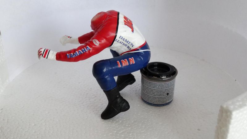 De helm en het gezicht is een lastig klusje als je bedenkt dat hij maar 2cm in doorsnee is. De decal op diverse plaatsen nog in moeten snijden om hem goed op de helm te krijgen. Dan het gezicht in tekenen. Bij het passen op de motor kwam de stand van het hoofd niet goed uit. Als ik hem zo monteer kijkt hij schuin naar beneden ipv vooruit. Dus ga ik hier ook nog in wijzigen en proberen een nek te modelleren. Dan kan ik de positie van het hoofd goed zetten. De lak van de helm staat nu uit te harden. Daarna nog één keer voorzichtig polijsten om de oneffenheden weg te halen.