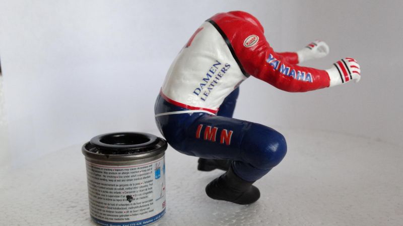 De stand van de benen was ok. De armen kwamen niet goed overeen met de stuurpositie en het is geen gezicht als hij zijn stuur niet goed vast heeft. Met een hobby slijpschijfje de bovenkant van de armen bijgewerkt voor de juiste pasvorm. Daarna alle kieren en naden dichtstoppen. Hierna wordt het schuren geblazen. Dan nog een keer nabewerken met vuller om hem helemaal goed af te werken.