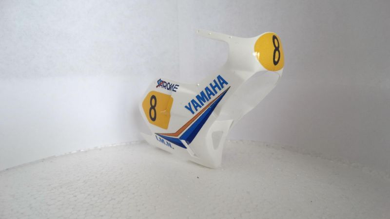 Op de zijkant van de kuip is in de S en A van het Sarome embleem een blauw oranje striping opgenomen. Die zit er bij de protarset niet ingetekend dus dat heb ik bijgewerkt. Het IMN vignet gewijzigd. Is bij protar van een andere uitvoering (gebogen). De Yamaha aanduiding nu ook in blauw gezet. Op papier de nodige proefafdrukken gemaakt, uitgeknipt en op de motor gepast. Dit herhaalt tot het resultaat ok was.