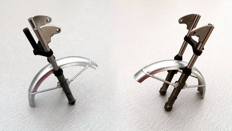 De rubbers van de voorvork waren doorgescheurd. Deze met een rubberpasta hersteld. Alles weer op kleur brengen en monteren.