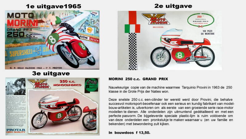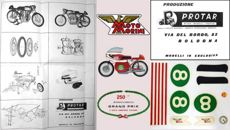 Tarquinio, zelf oud wegracer had goede resultaten behaald met deze Moto Morini. Nadat hij noodgedwongen na een ernstig wegrace ongeval moest stoppen met de actieve racesport besloot hij bouwmodellen te ontwikkelen. Het was een logische keuze dat hij met de Morini de spits ging afbijten. Overigens was hij zich toen nog niet bewust wat hij met dit model te weeg bracht. Binnen korte tijd vloog de vraag naar modellen om hoog. Bij iedere nieuwe productie werd de doos vernieuwd. De inhoud bleef voor zover mij bekend gelijk aan het basismodel. De rest van het verhaal is geschiedenis. Protar zette de toon in modelbouwland.