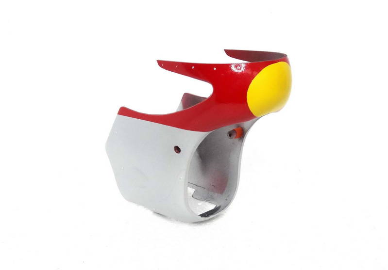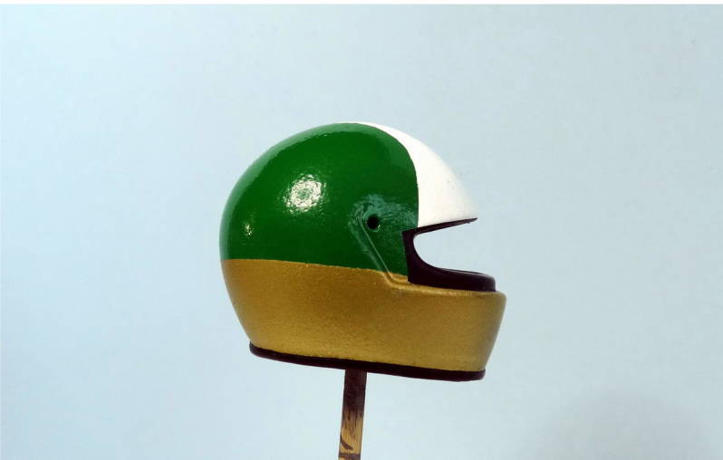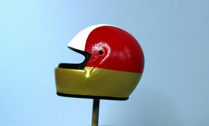 Als 1e de helm gestript. Decals verwijderd, schuren en in de grondlak. Zo laat ik hem even tot na de aanpassingen met het figuur op de motor. Een beschadiging is zo gemaakt.