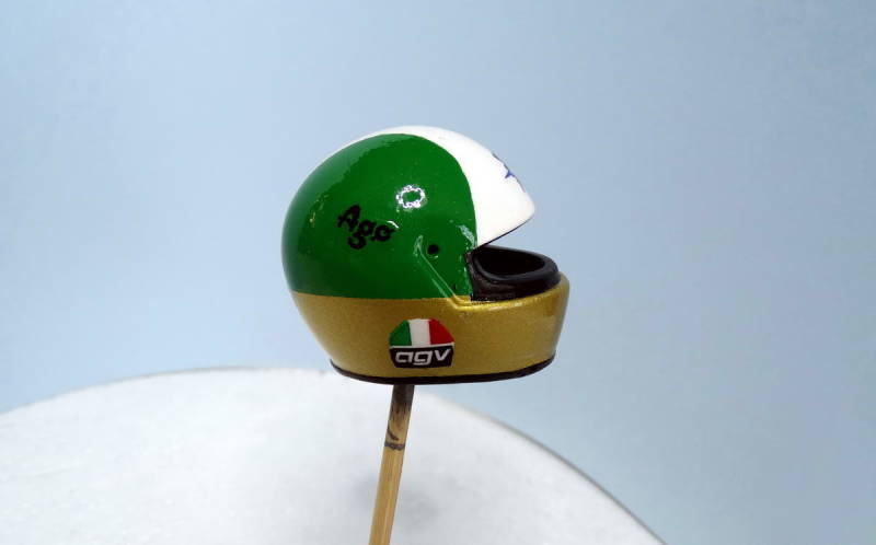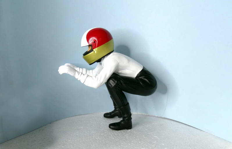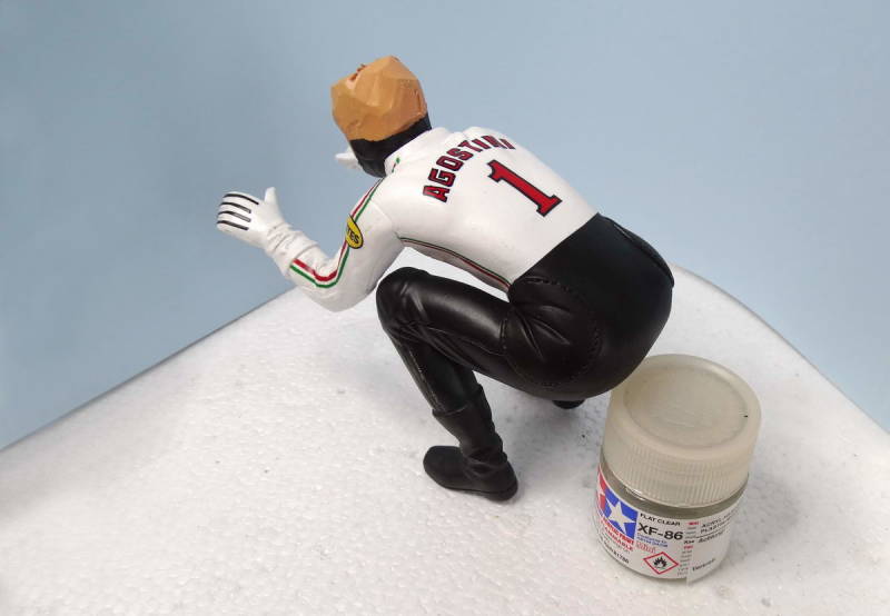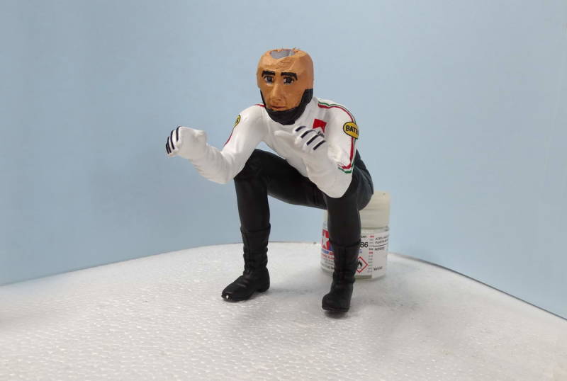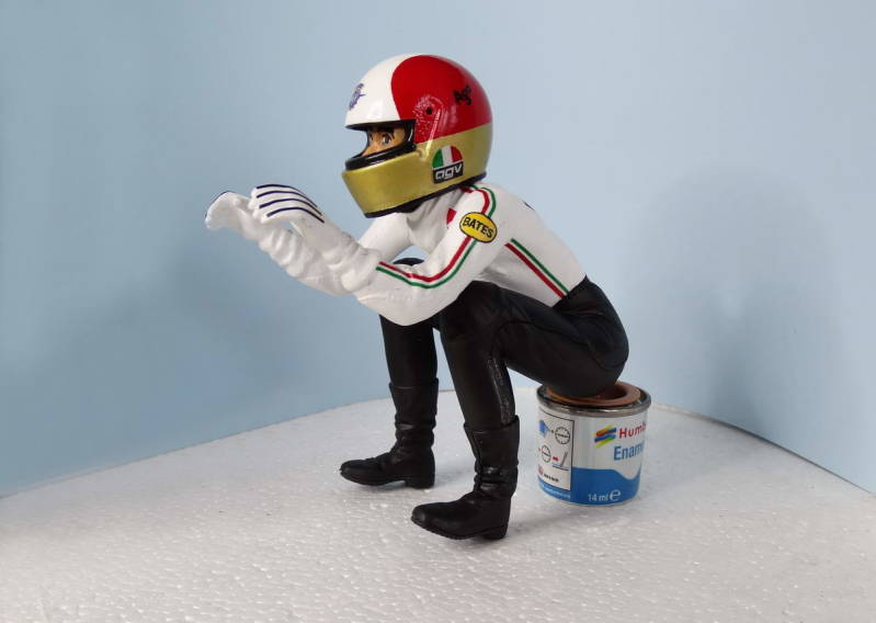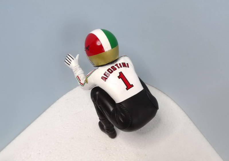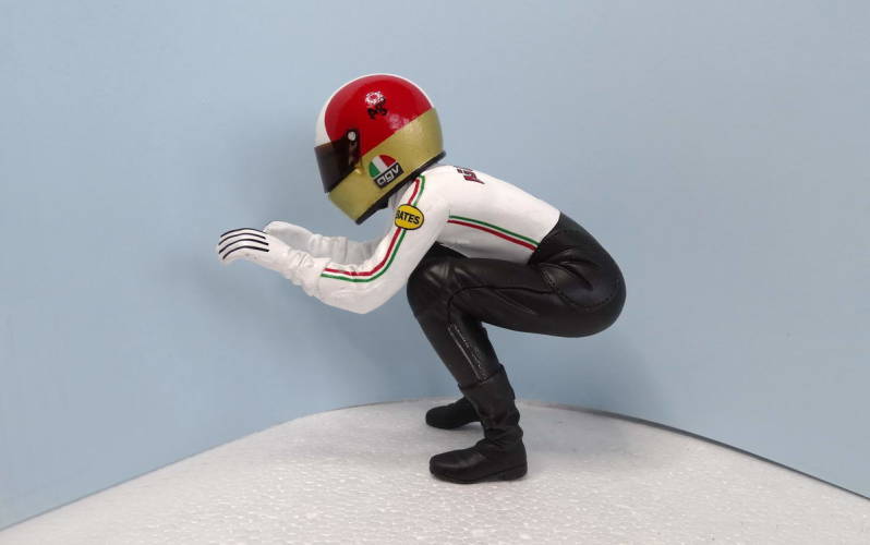 Aan de slag dus met als doel de MV Agusta weer te voorzien van zijn stroomlijn. De rijders figuur zal worden uitgevoerd als Giacomo Agostini in zijn bekende zwart-witte race overall en met integraal helm.