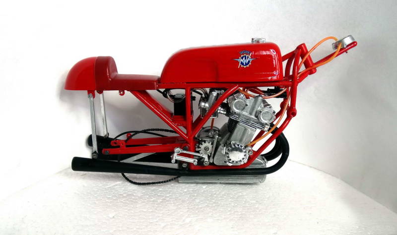 2 jaar geleden een MV 500 3 cylinder verkregen zonder kuip. De eigenaar had dezelfde tik als ik. Het motorblok is te mooi om er een kuip om heen te hangen. Enige verschil. Hij had de kuip weggedaan en dat doe ik niet. Die hang ik er achter in mijn vitrine. Het model was goed gebouwd maar was vuil en zat dik onder het stof. Hij had al jaren in de schuur gestaan.