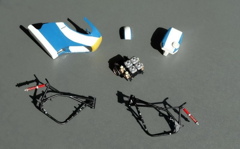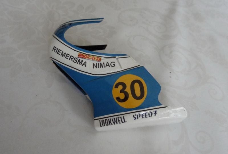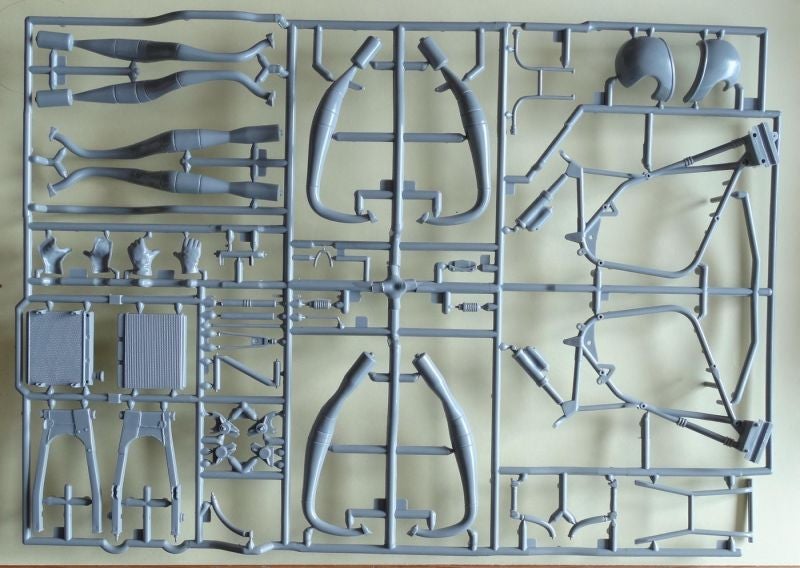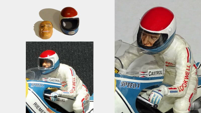 De helm links op de foto is inmiddels weer vervangen. Dit helmpje hoort bij het Revell model maar is in verhouding tot het lichaam klein. De rijder kits van Tamiya (rechts op de foto) hebben een grotere helm en een natuurlijker gezicht. Die had ik al gebruikt voor Jack en Boet en vond ik mooier om te zien.