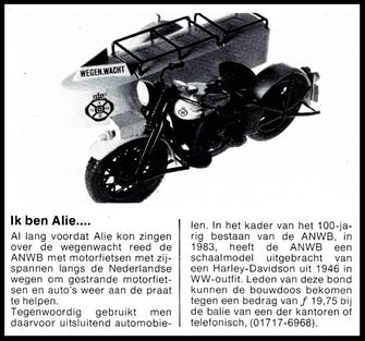 Via de afgebeelde advertentie kondigde de ANWB ter ere van het 100 jarig bestaan in 1983 de komst van dit leuke bouwmodelletje aan. Ik was er gelijk bij en schafte er één aan. Nog gebouwd op de oude manier en geschilderd met de kwast en de bekende Humbrol verf.