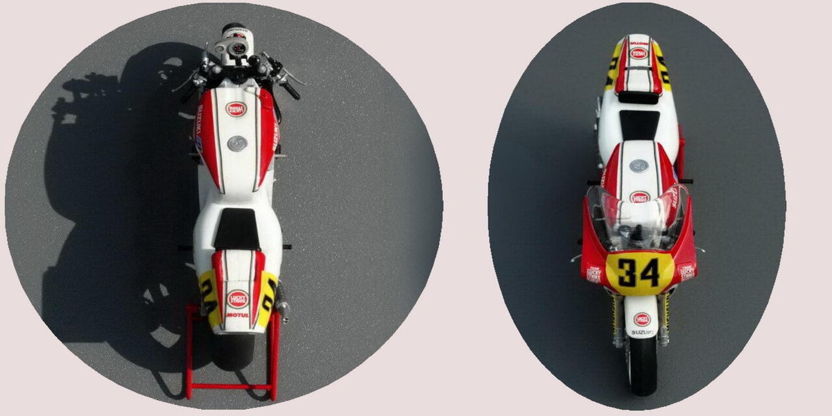 Fujimi is het enige merk dat de Suzuki van Schwantz als bouwpakket levert zij het in de Pepsi Cola uitvoering waar Schwantz eerder mee reed. Uiteraard heb ik deze decals niet gebruikt maar zelf de decals van Lucky Strike gemaakt zodat de motor nu weer in zijn Wereldkampioenschapskleuren staat. Overigens alle lof voor Fujimi want het model is zeer gedetailleerd en uitstekend van pasvorm.