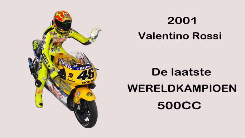 2001 is het laatste jaar dat de 500cc klasse verreden is. Rossi mag zich dus de laatste wereldkampioen 500cc klasse noemen. In 2002 start de nieuwe koningsklasse met een cilinderinhoud van 990 cc en Valentino werd in dat jaar ook wereldkampioen waardoor hij zich ook weer de 1e wereldkampioen in deze klasse mag noemen. Inmiddels weten wij dat Valentino Rossi zal uitgroeien tot de smaakmaker van de Koningsklasse en dat er nog vele wereldtitels zullen volgen.